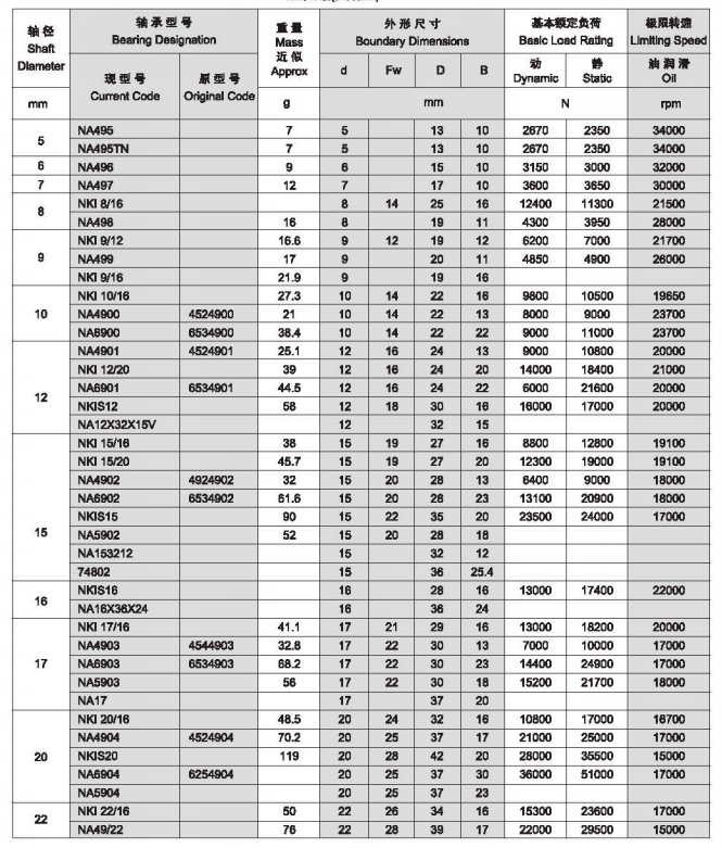 The solid collar needle roller bearing has compact structure, small radial size and large load carrying capacity, It is suitable for the parts of which the radial overall size is limited, It is also wide applied to the situation where the shaft or housing has the swinging motion. In general, the needle roller bearing only withstands the radial load, not the axial load. When the shaft has axial load,it can be used in combination with other bearings.However it does not limit the axial shift of shaft or housing. The limiting rotational speed of needle roller bearing is lower In high rotational speed of main machine, the needle roller bearing with cage shall be chosen as far as possible. In compassion with other types of needle roller bearings, under the situation of same radial size, the needle roller bearing has the large load carrying capacity and high rigidity but has high friction torque.